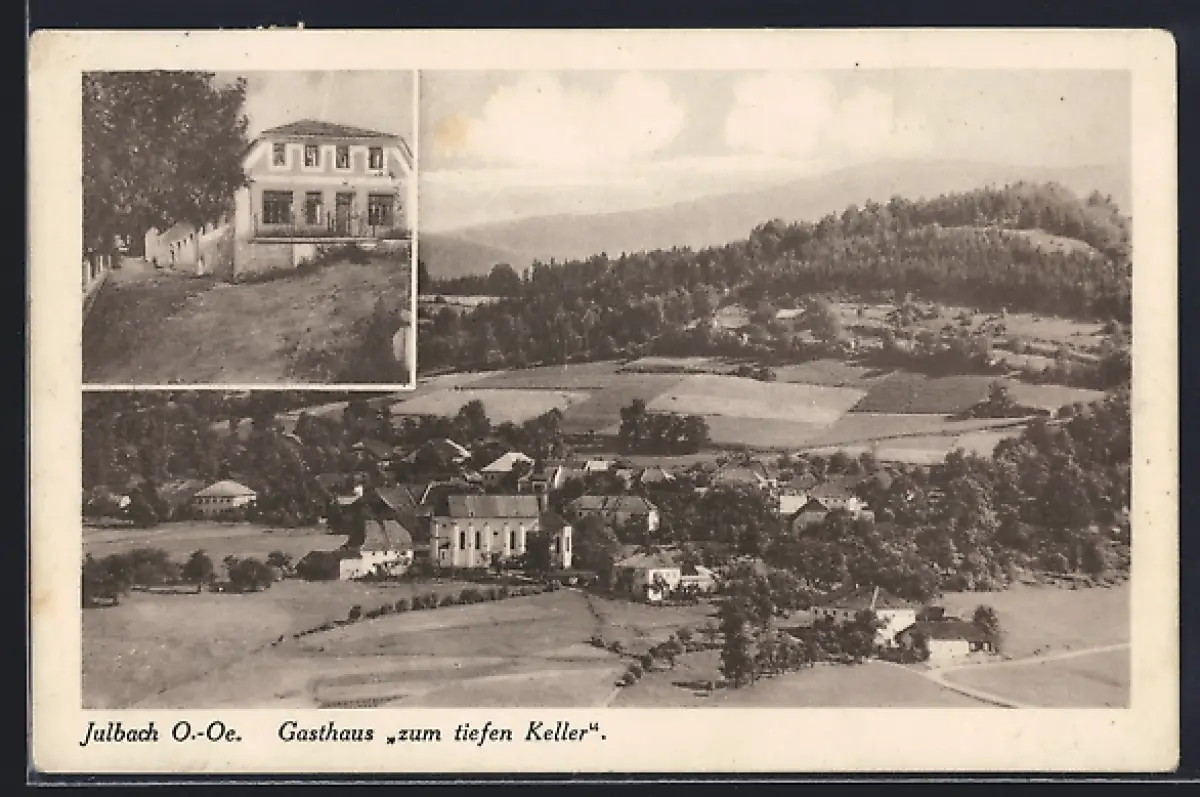AK Julbach /O. Ö., Gasthaus zum tiefen Keller, Ortsansicht aus der Vogelschau