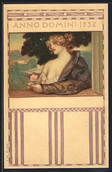 AK Junge Frau mit Rose in der Hand blickt wartend über die Landschaft, Jugendstil