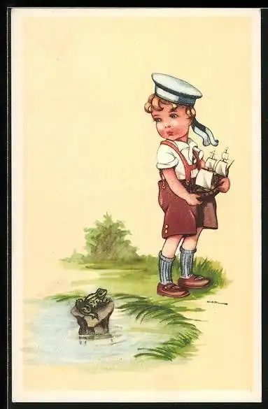AK Junge mit Modellsegelboot und Matrosenmütze sieht Frosch im Teich