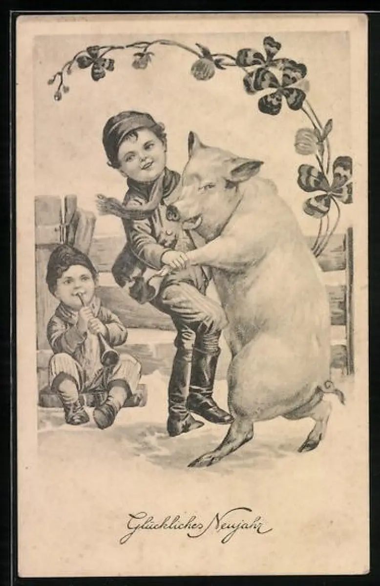 AK Junge tanzt mit einem Schwein, Glückliches Neujahr, vermenschlichte Tiere