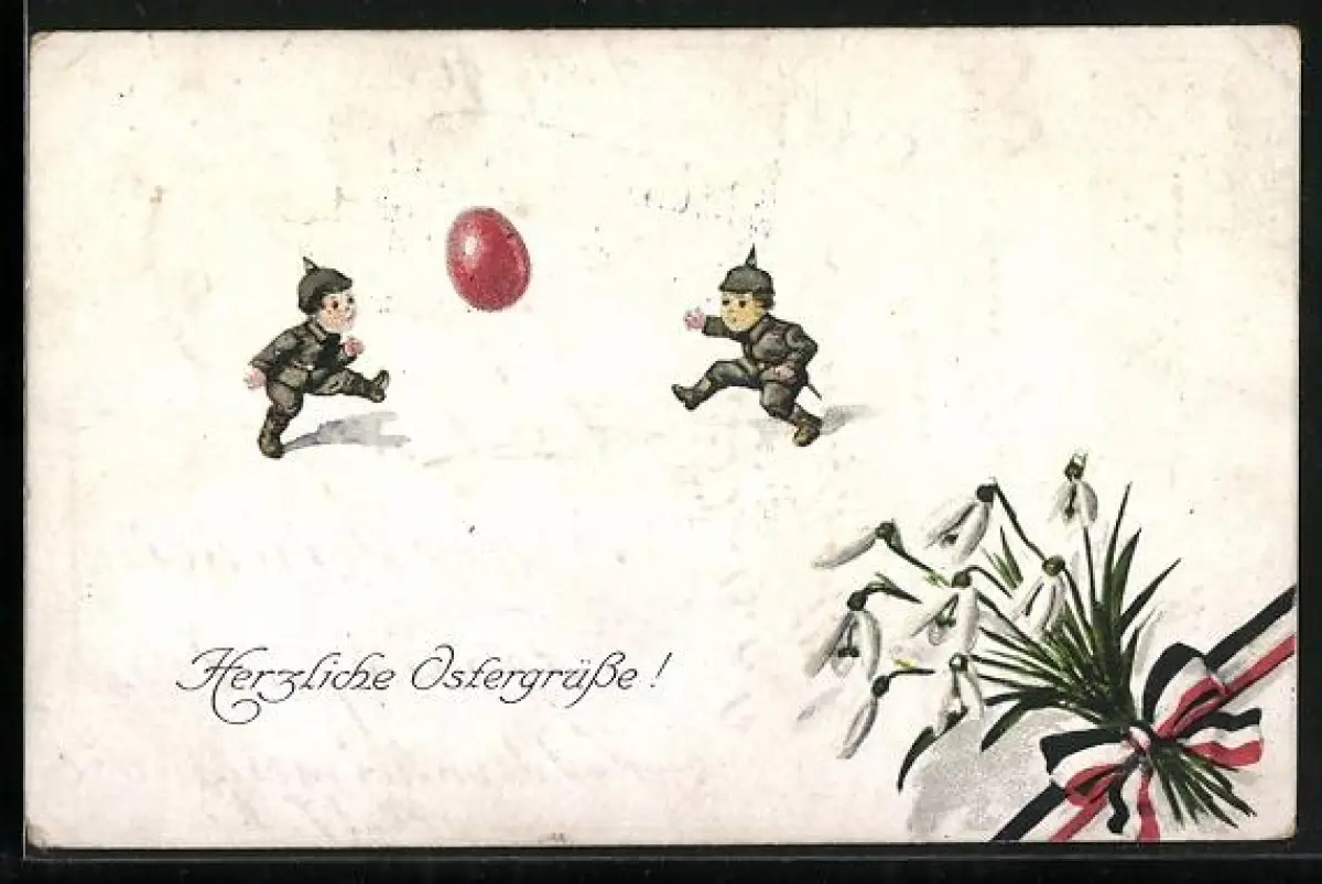 AK Jungen in Uniform mit Pickelhaube spielen Fussball mit einem Osterei, Schneeglöckchen mit Schleife