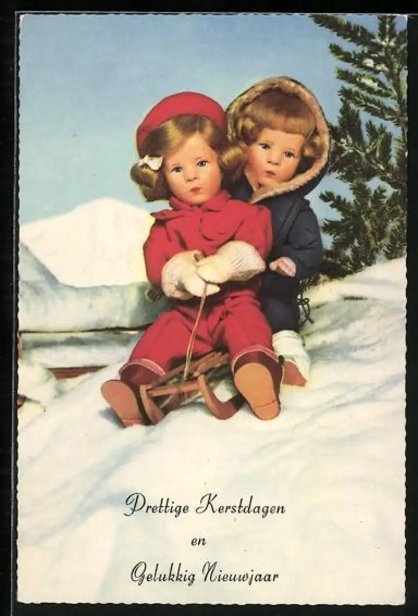 AK Käthe Kruse-Puppe, Schneelandschaft mit Junge und Mädchen auf einem Schlitten