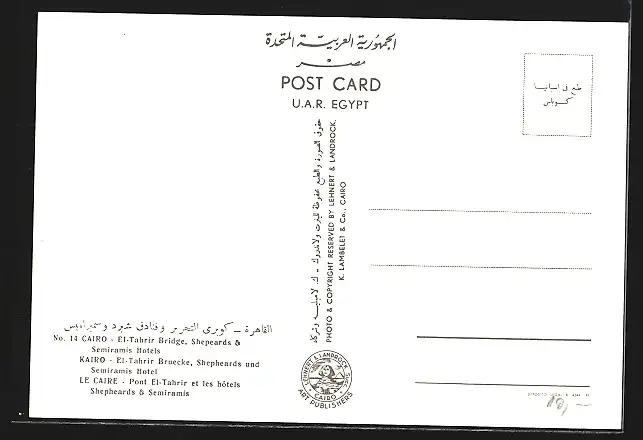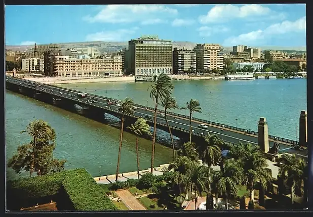 AK Kairo, El-Tahrir Brücke, Shepheards und Semiramis Hotel