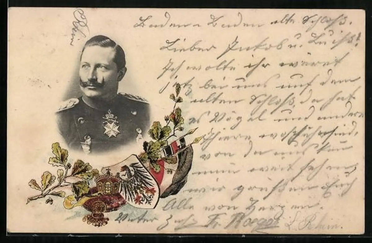 AK Kaiser Wilhelm II. im Porträt, Flaggen und Wappen