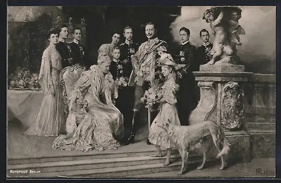 AK Kaiserin Auguste Viktoria auf einen Thron im Kreise ihrer Lieben, Windhund