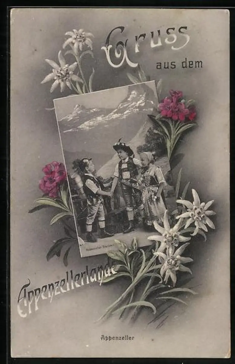AK Kanton Appenzell, Kinder in Trachten, schöner Rahmen mit Blumen verziert