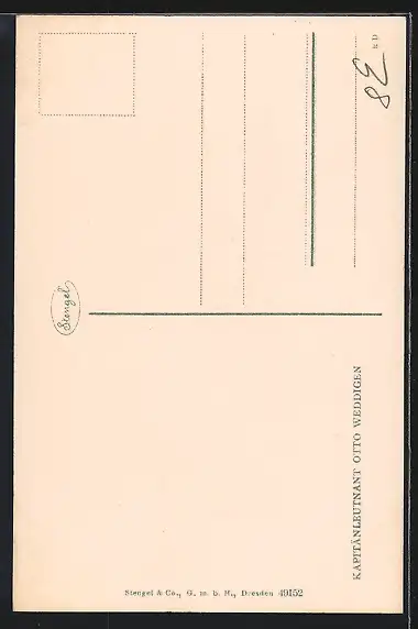 Personenbezogene Daten auf der Rückseite der Karte wurden durch blauen Textmarker unkenntlich gemacht. Die blauen Stellen sind auf die Vorderseite durchgeweicht und wirken sich negativ auf das Postkartenfoto aus