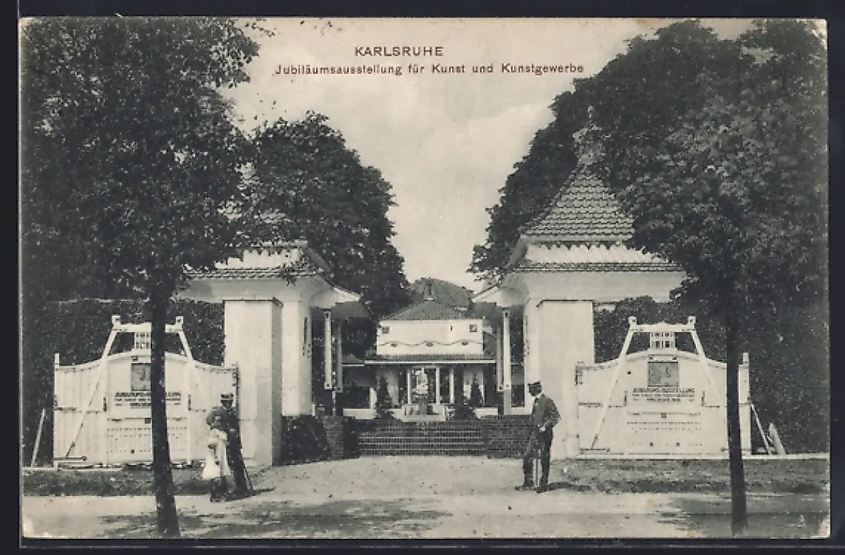 AK Karlsruhe, Badische Jubiläums-Ausstellung für Kunst und Kunstgewerbe, Eingang zum Ausstellungsgelände mit Besuchern