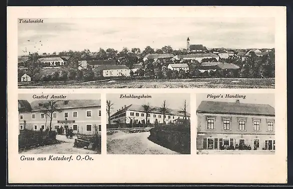 AK Katsdorf, Gasthof Amstler, Erholungsheim, Ployer`s Handlung und Totalansicht