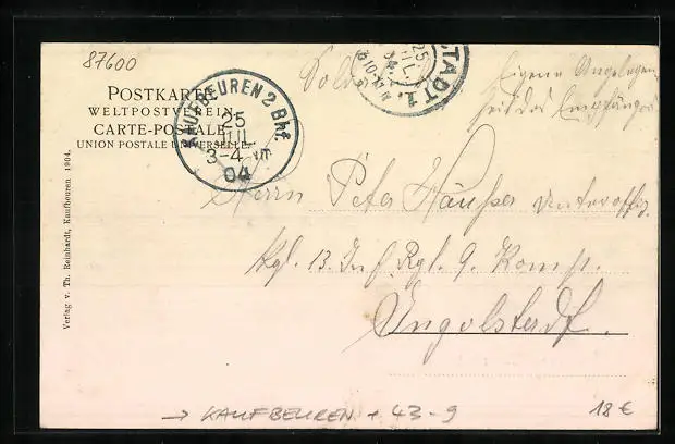 alte Ansichtskarte, gelaufen 1904 als Feldpost, guter Zustand