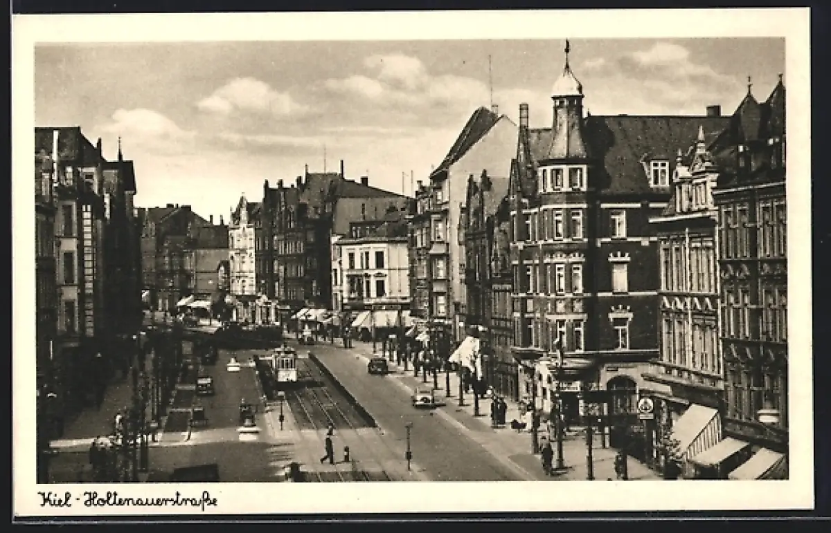 AK Kiel, Strassenbahn in der Holtenauerstrasse mit Geschäften