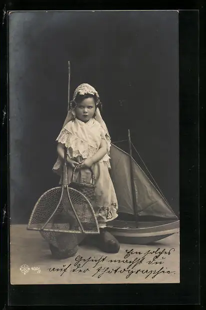 AK Kind in Holzschuhen mit einem Kescher, Fischerei