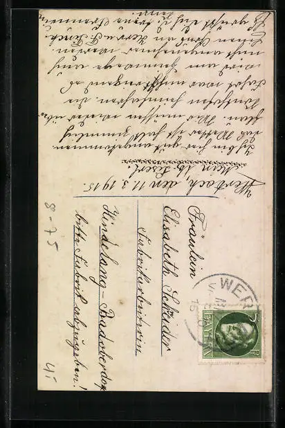 Personenbezogene Daten auf der Rückseite der Karte wurden durch blauen Textmarker unkenntlich gemacht. Die blauen Stellen sind auf die Vorderseite durchgeweicht und wirken sich negativ auf das Postkartenfoto aus