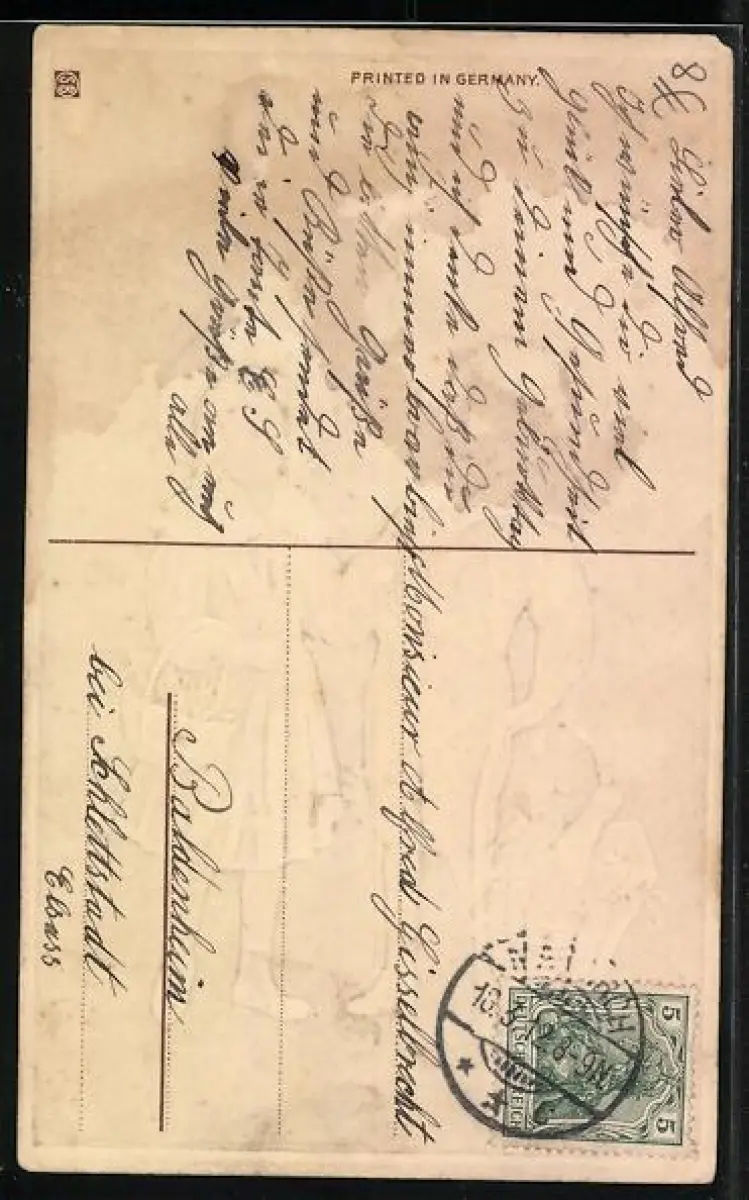 Personenbezogene Daten auf der Rückseite der Karte wurden durch blauen Textmarker unkenntlich gemacht. Die blauen Stellen sind auf die Vorderseite durchgeweicht und wirken sich negativ auf das Postkartenfoto aus