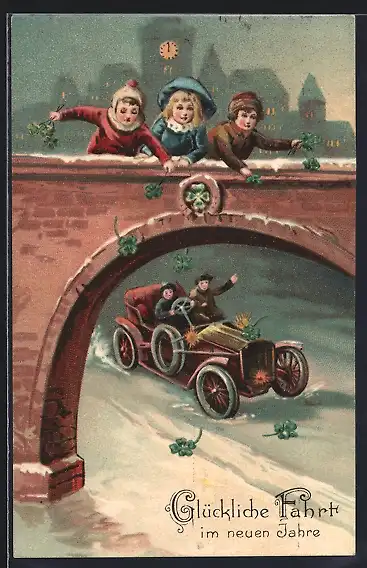 AK Kinder streuen Glücksklee auf die Fahrbahn, Auto fährt durch, Neujahrskarte