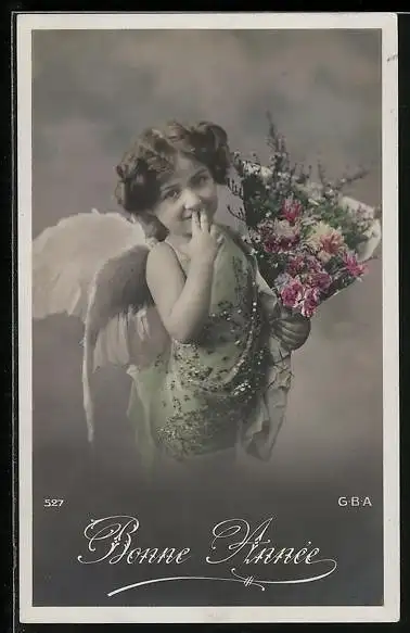 AK Kleiner Neujahrsengel mit Blumenstrauss