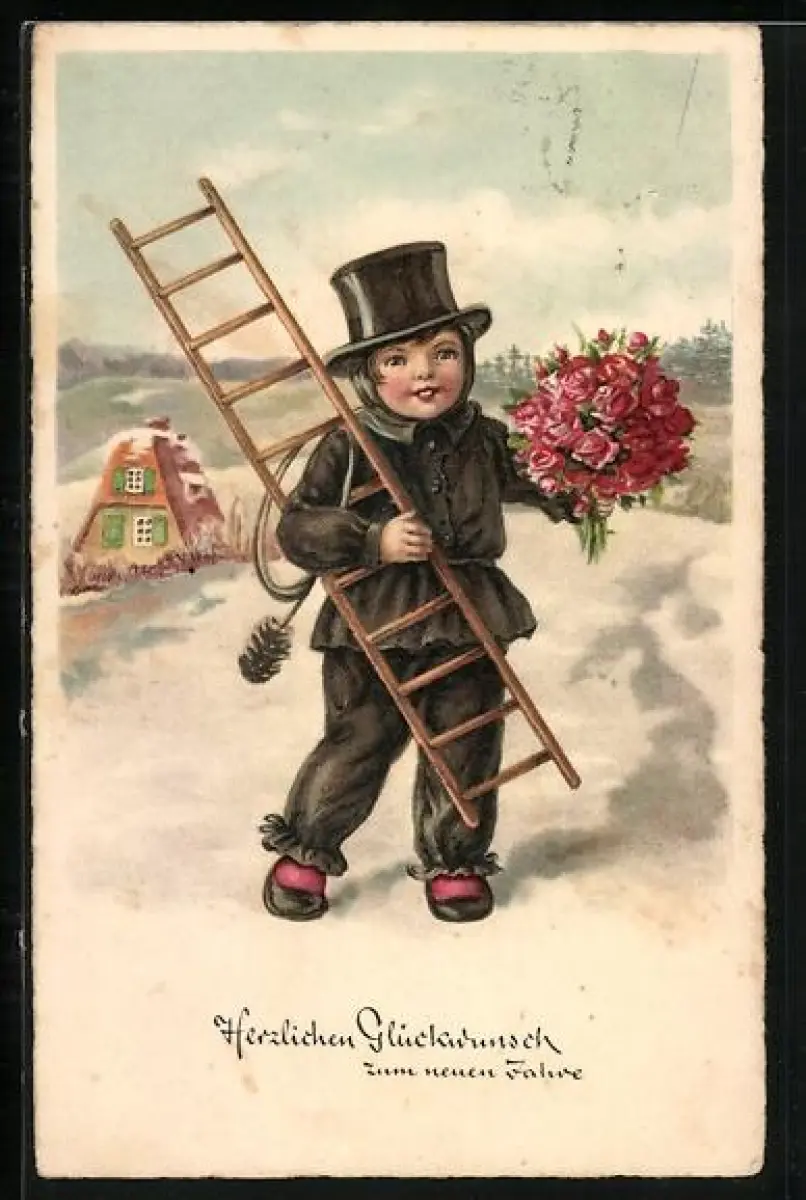 AK Kleiner Schornsteinfeger mit Rosenstrauss vor verschneitem Dorf, Neujahrsgruss