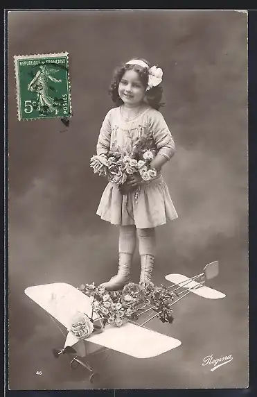 AK Kleines Mädchen mit Blumen auf einem Eindecker-Flugzeug