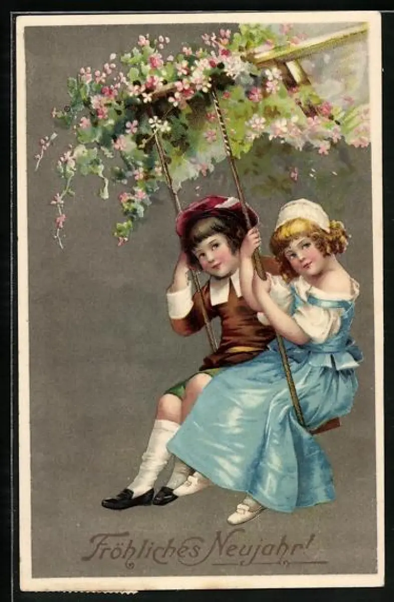 AK Kleines Paar auf einer Schaukel mit Blumen, Neujahrsgruss
