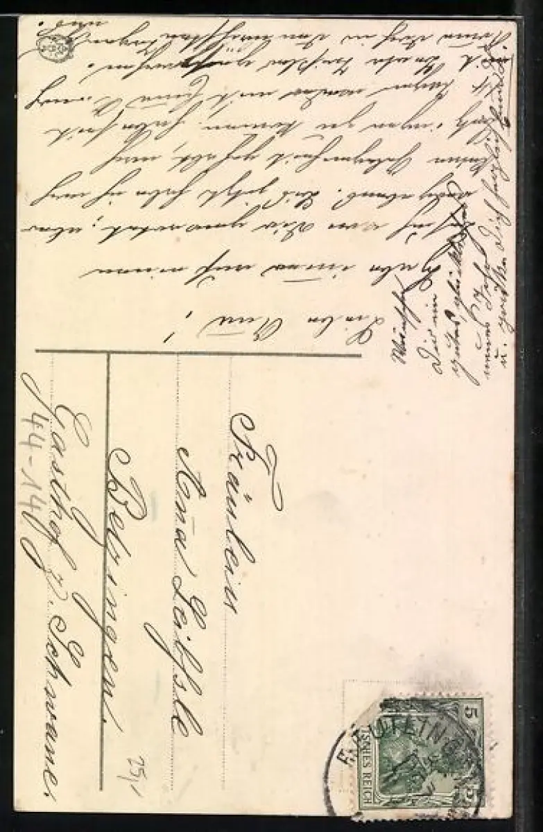 Personenbezogene Daten auf der Rückseite der Karte wurden durch blauen Textmarker unkenntlich gemacht. Die blauen Stellen sind auf die Vorderseite durchgeweicht und wirken sich negativ auf das Postkartenfoto aus