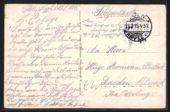 gelaufen 1915, Eckknicke li. oben, guter Zustand