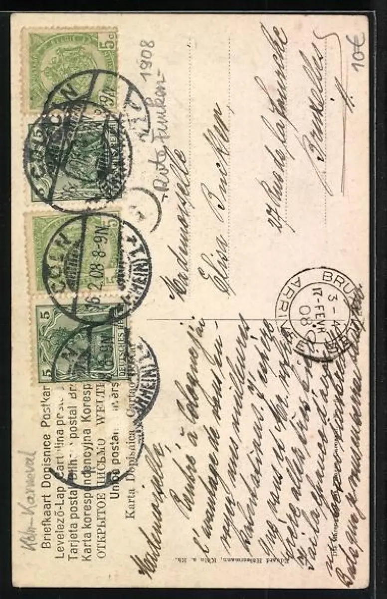 gelaufen 1908, Eckknick re. unten, guter Zustand
