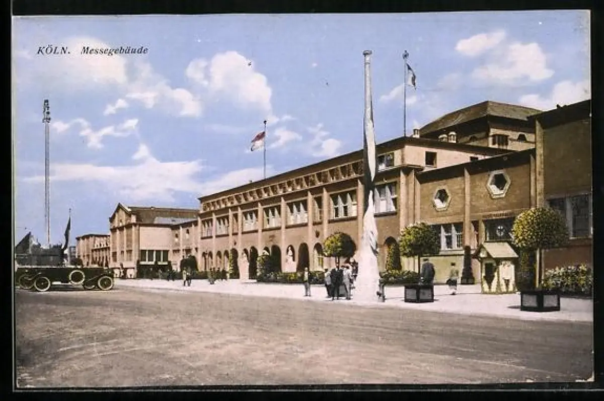 AK Köln, Passanten vor dem Messegebäude