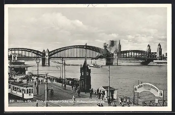 AK Köln /Rh., Blick von Hängebrücke nach Hohenzollernbrücke