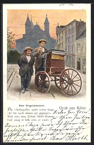 AK Köln, Zwei Männer am Leierkasten mit Vers Der Orgelsmann