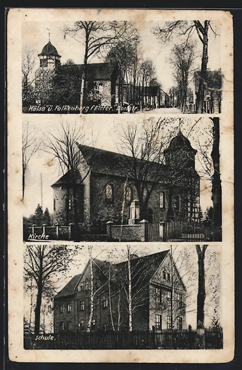 AK Kölsa / Elster, Dorstrasse, Schule und Kirche