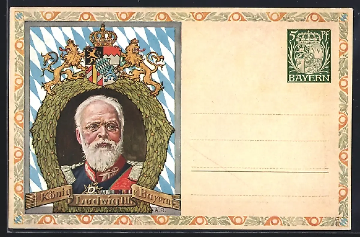 AK König Ludwig III. v. Bayern, Portrait mit Eichenkranz, Briefmarken, Ganzsache Bayern