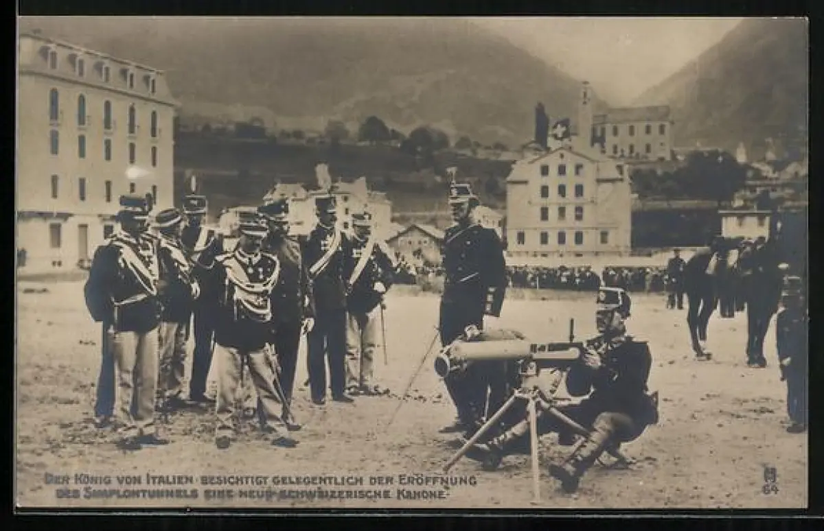AK König von Italien besichtigt gelegentlich der Eröffnung des Simplontunnels eine neue schweizerische Kanone
