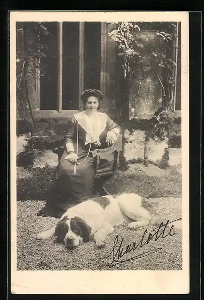AK Königin von Württemberg im Garten auf einem Stuhl sitzend, Bernhardiner