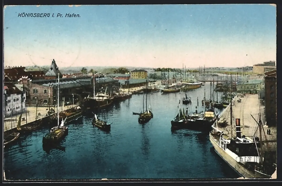 AK Königsberg, Hafen, Segel-und Dampfschiffe, Lagerhalle aus der Vogelschau