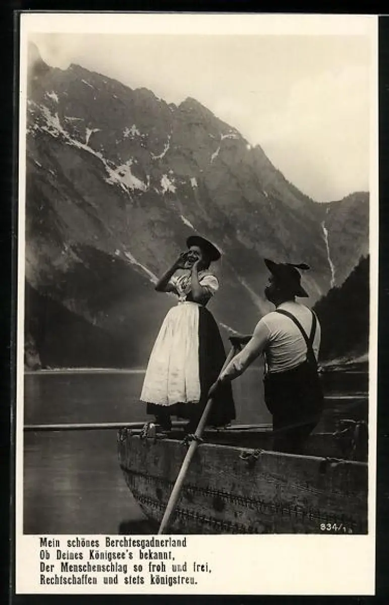 AK Königssee / Berchtesgaden, Paar in Trachten in einem Ruderboot