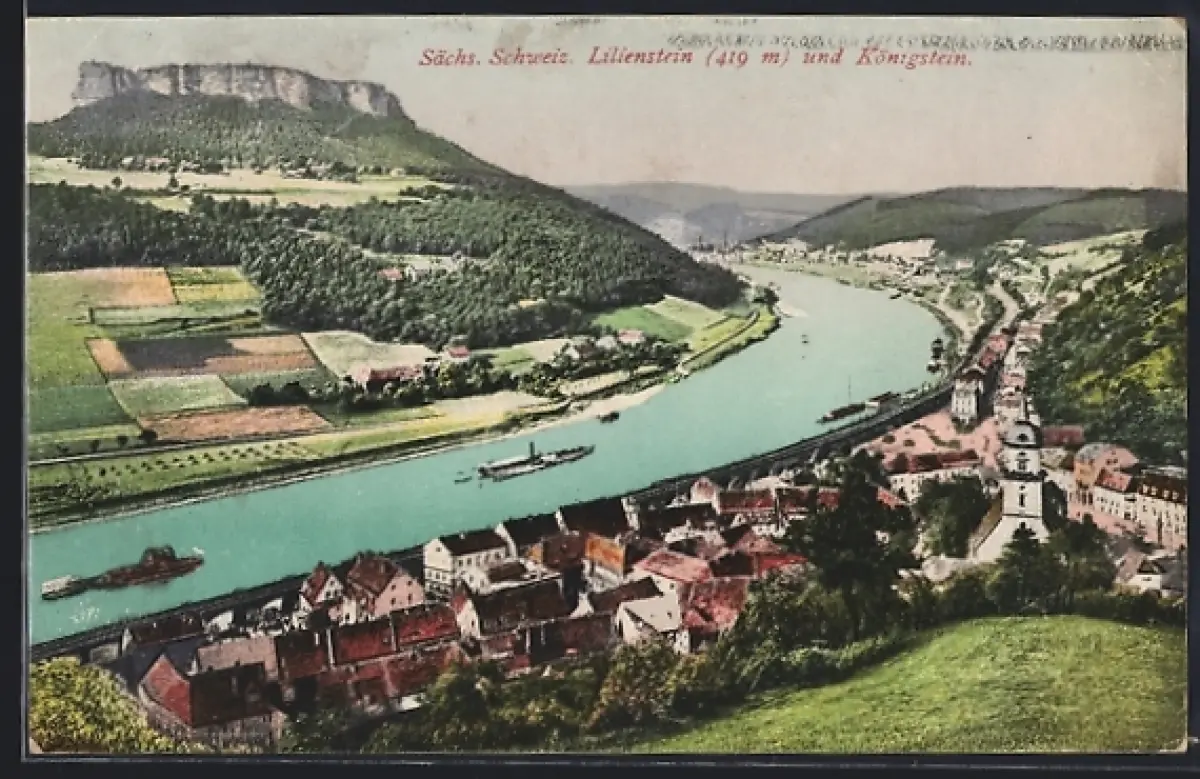 AK Königstein /Sächs. Schweiz, Lilienstein, Elbe, Stadtansicht