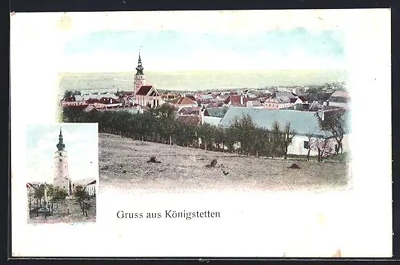 AK Königstetten, Blick über die Dächer, Partie an der Kirche