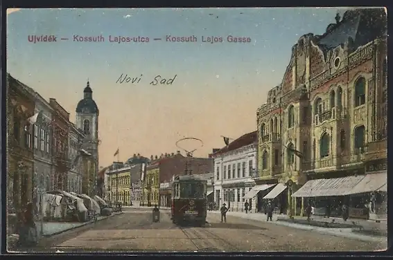 AK Kossuth, Lajos Gasse mit Strassenbahn und Geschäften, Turm