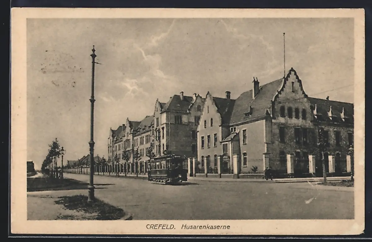 AK Krefeld, Husaren-Kaserne, Strassenbahn