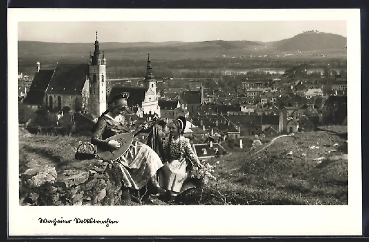 AK Krems /Donau, Ortsansicht mit Kirche, Frauen in Wachauer Volkstrachten