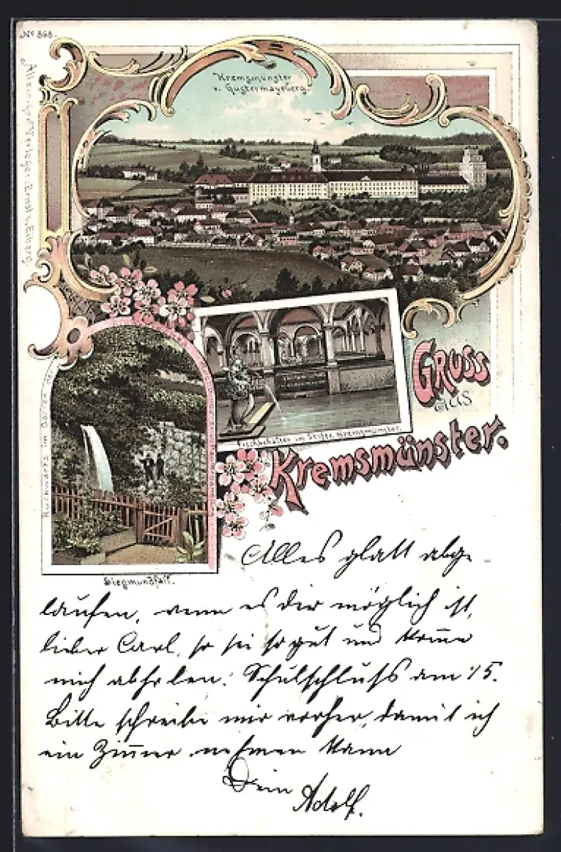 AK Kremsmünster, Totalansicht vom Gustermayrberg, Fischbehälter im Stift, Siegmundfall