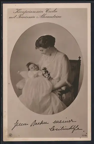 AK Kronprinzessin Cecilie in weiss mit Prinzessin Alexandrine auf dem Arm