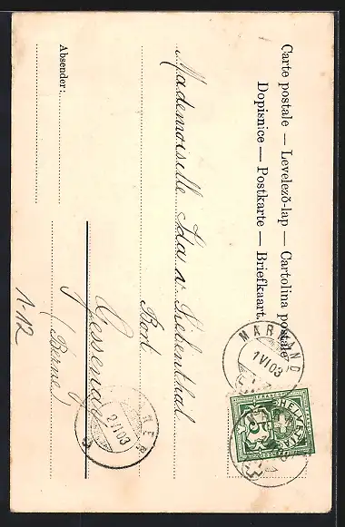 alte Ansichtskarte, gelaufen 1903, Bugspur oben, guter Zustand