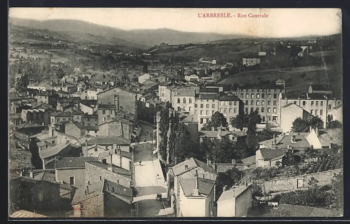 AK L`Arbresle, Rue Centrale et vue sur les toits du village et les collines environnantes
