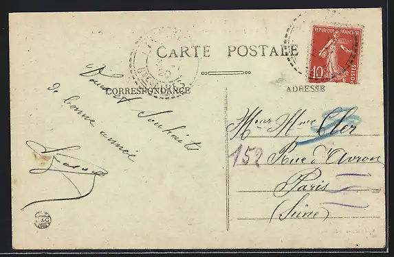 Personenbezogene Daten auf der Rückseite der Karte wurden durch blauen Textmarker unkenntlich gemacht. Die blauen Stellen sind auf die Vorderseite durchgeweicht und wirken sich negativ auf das Postkartenfoto aus