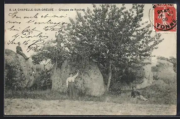 AK La Chapelle-sur-Oreuse, Groupe de Roches avec personnes se reposant et arbre central