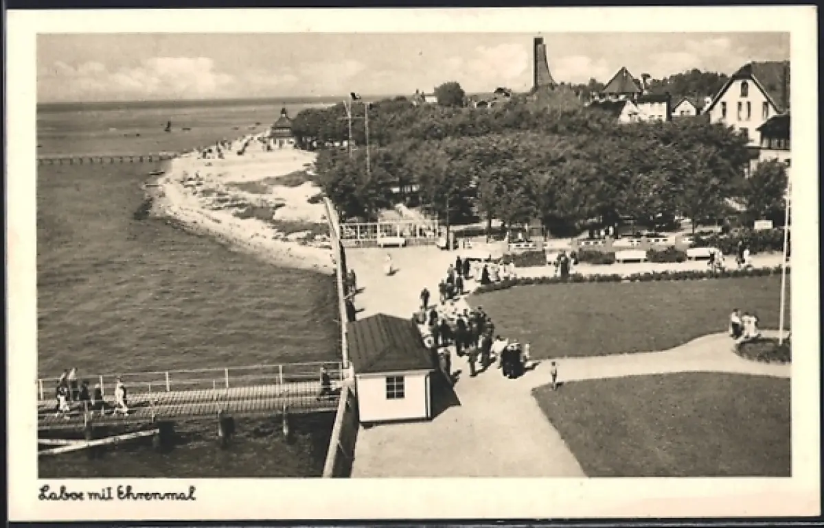 AK Laboe, Ehrenmal, Strand, Promenade, Blick von oben