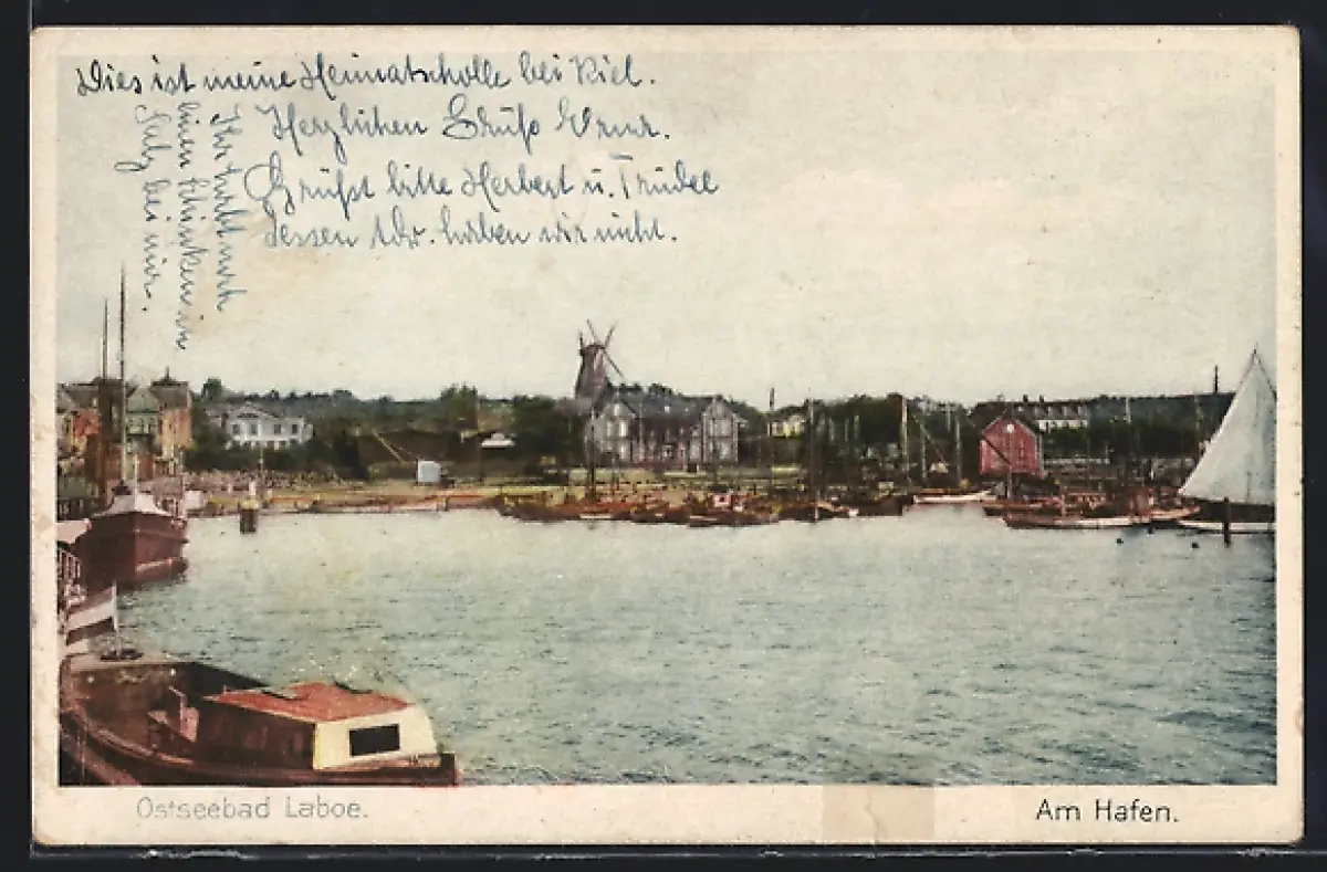 AK Laboe, Ortspartie vom Hafen aus gesehen