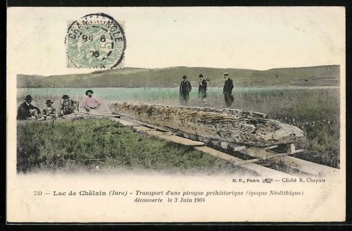 AK Lac de Châlain /Jura, Transport d`une piroque préhistorique, époque Néolithique