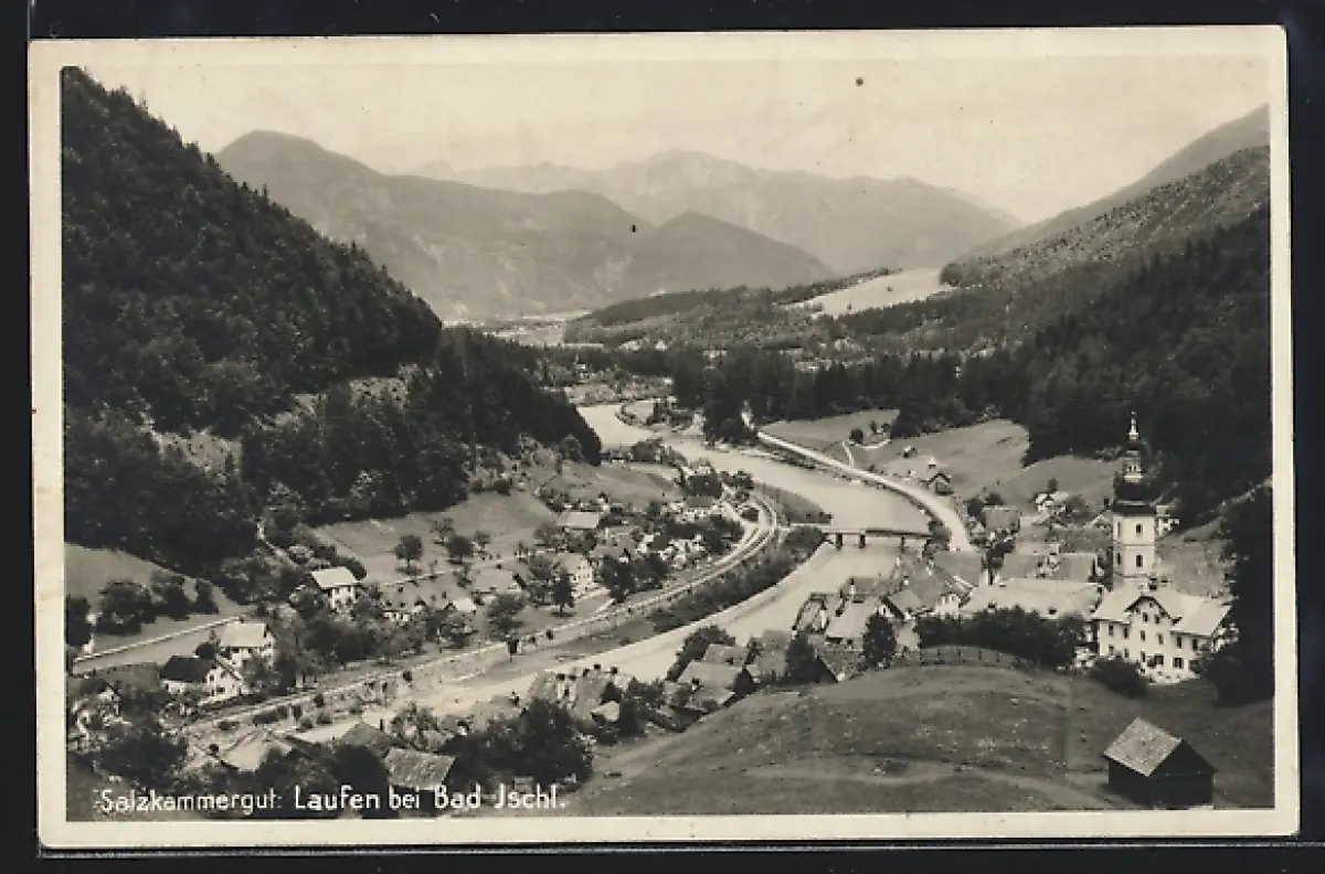 AK Lauffen bei Bad Ischl, Totalansicht mit Brücke aus der Vogelschau